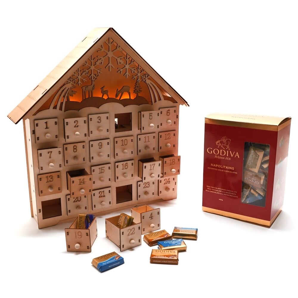 アドベントカレンダーとゴディバのチョコレートがセットになった、お楽しみアドベントカレンダーです!