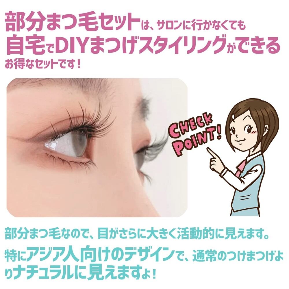 まつげキットはサロンに行かなくても自宅でDIYまつげスタイリングができる部分まつ毛セットです! 部分まつ毛なので、目がさらに大きく活動的に見えます。 特にアジア人向けのデザインで、通常のつけまつげよりナチュラルに見えます! 毎回長いつけまつげを切って使ってませんか? 切る必要なし!便利な部分つけま。 付けていることを忘れるようなナチュラル感。