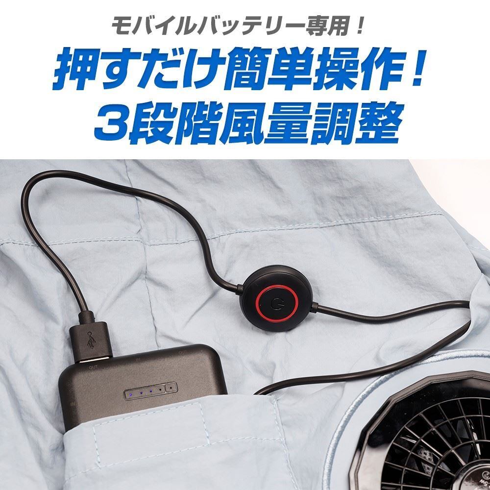 モバイルバッテリーに接続し、押すだけで簡単操作ができる、3段階風量調整ボタンが付いており、